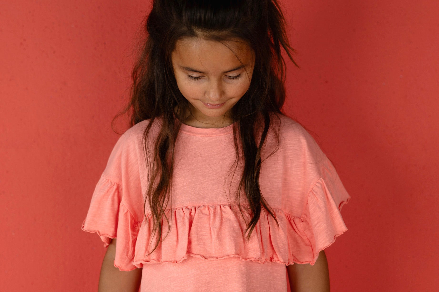 Lief zomerjurkje! Met ruffles op de borst en op de mouwen. Gemaakt van een zachte biologisch katoenen stof in de koraalroze kleur ‘Coral’. Het leren Nixnut labeltje is bevestigd aan de onderkant van het jurkje.